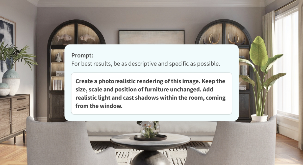 Yes. AI Enhancement works seamlessly on both room mock-ups created using our moodboard editor and on any 3D renders you create using the DesignFiles 3D Floor Planner. You can elevate both options with photo realistic lighting and texture to bring them to life.