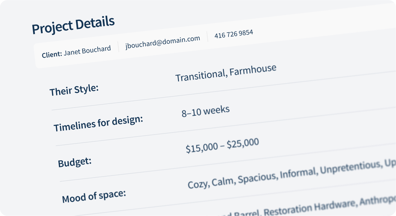Every designer and project is different. Customize each questionnaire to match the exact info you need, whether it’s about style, scope, budget, or timeline.