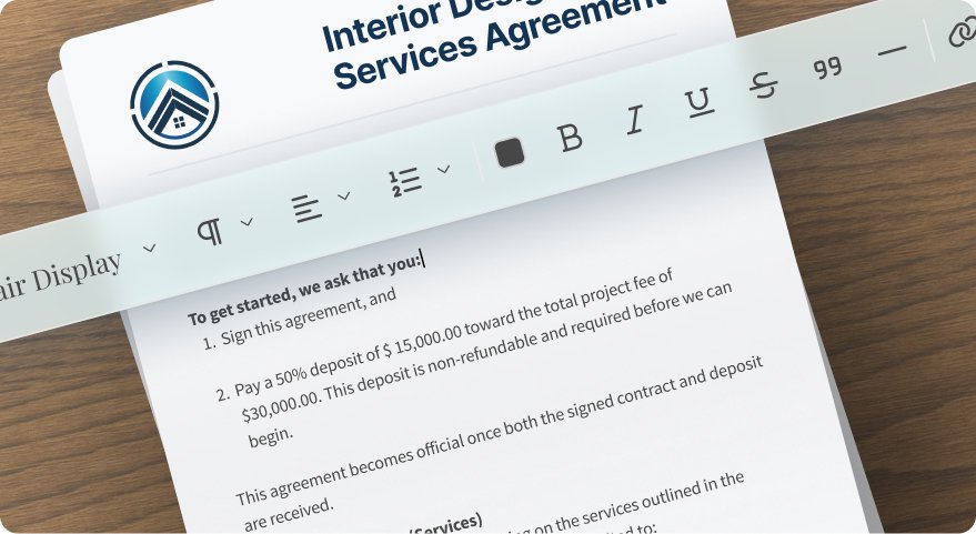 No need to start from scratch. Just copy/paste your interior design contract directly into the editor, brand it, and you’re ready to go.